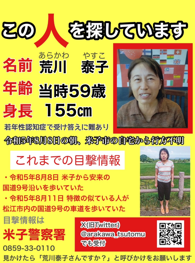 鳥取県米子市で若年性認知症と診断された荒川泰子さんが行方不明となり、まもなく2年という時間が過ぎようとしています。