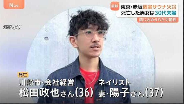 赤坂の個室サウナで起きた火災事故により、松田政也さん(36)と松田陽子さん(37)は、あまりにも突然命を落としました。
