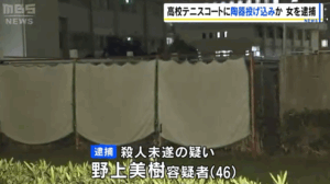 野上美樹容疑者は、大阪府立東淀川高校の授業中のテニスコートに陶器やスプレー缶を投げ込んだとして逮捕されました。