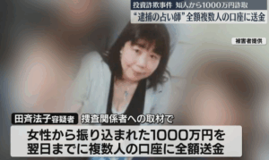 田斉法子容疑者は、占い師という立場を利用して信用を獲得し、その後は高級腕時計や投資話を用いて莫大な金額を集めたとみられています。