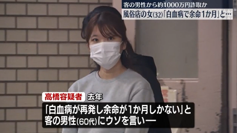 風俗店従業員の高橋麻美香容疑者(32)が、客の男性に「白血病が再発した」「余命1か月しかない」などと虚偽の説明をして、入院費名目で約1000万円を騙し取ったとして警視庁に逮捕されました。